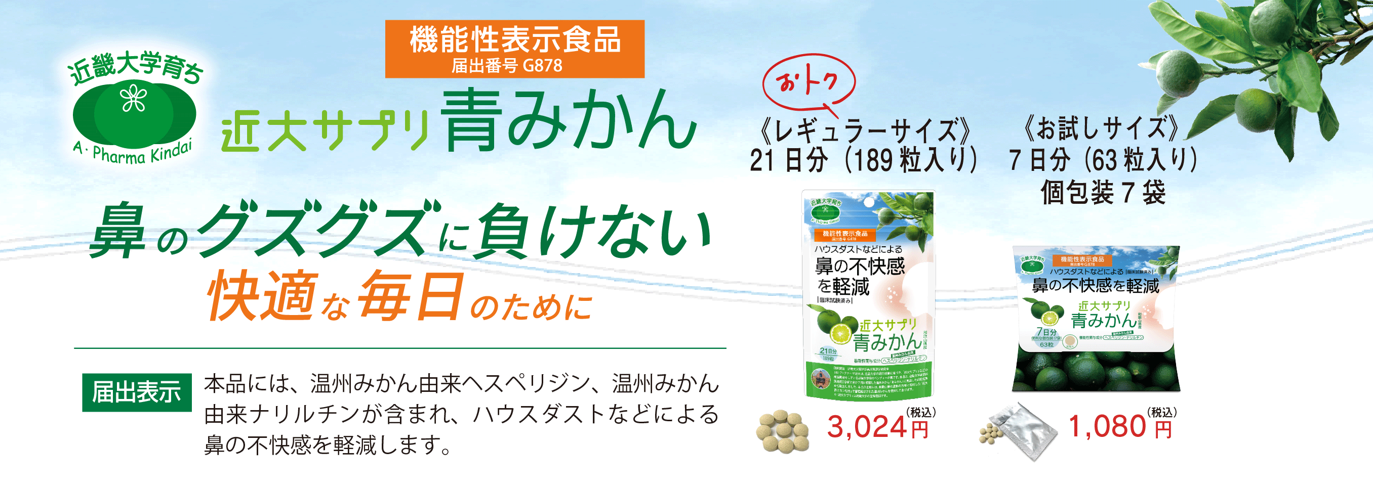 3,024円(税込)鼻の不快感に負けない快適な毎日のために「機能性表示食品 近大サプリ 青みかん」をご活用ください。 -